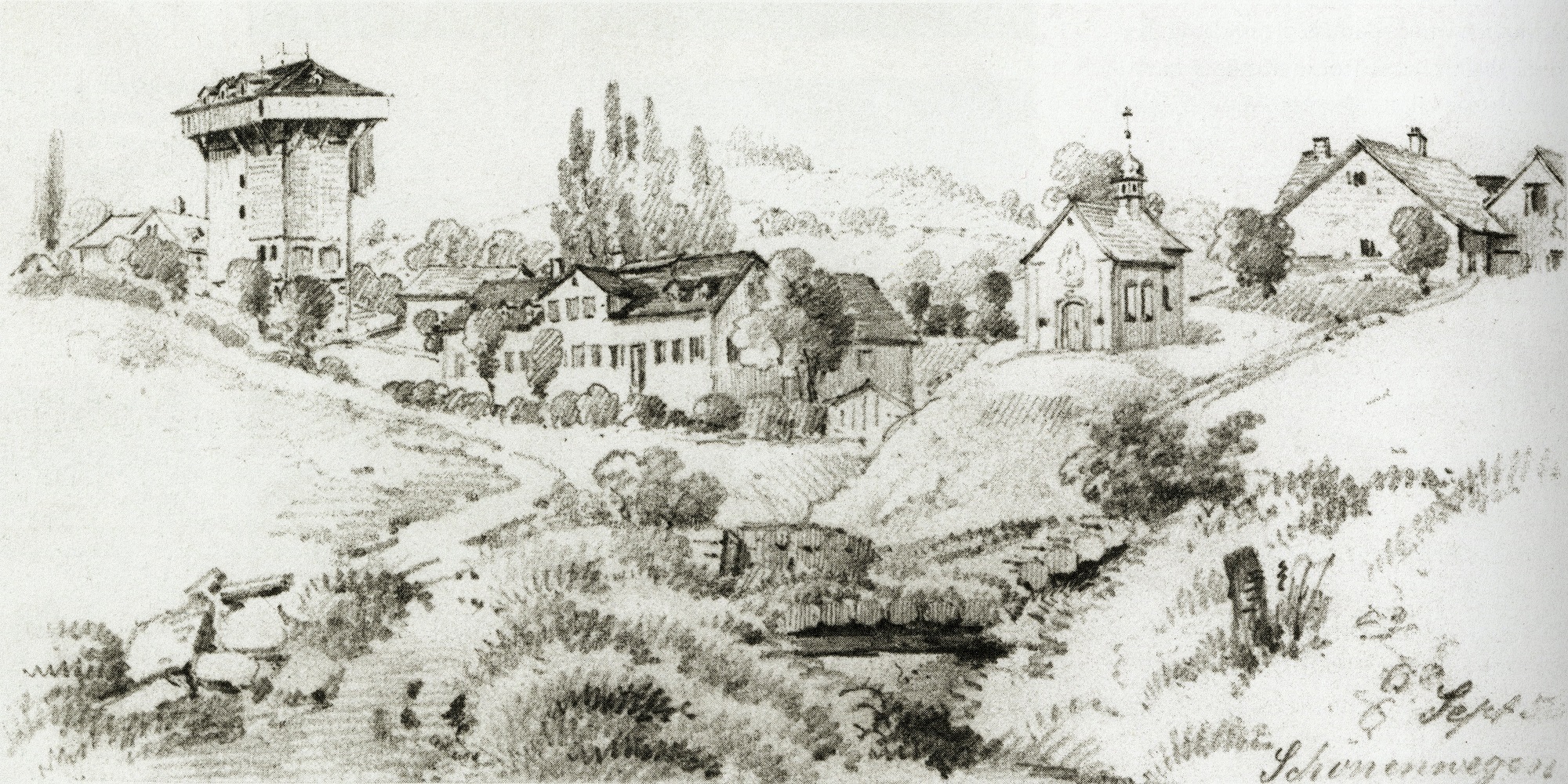 Bild 1: Sicht von Schönenwegen auf den Tröckneturm im Jahr 1856